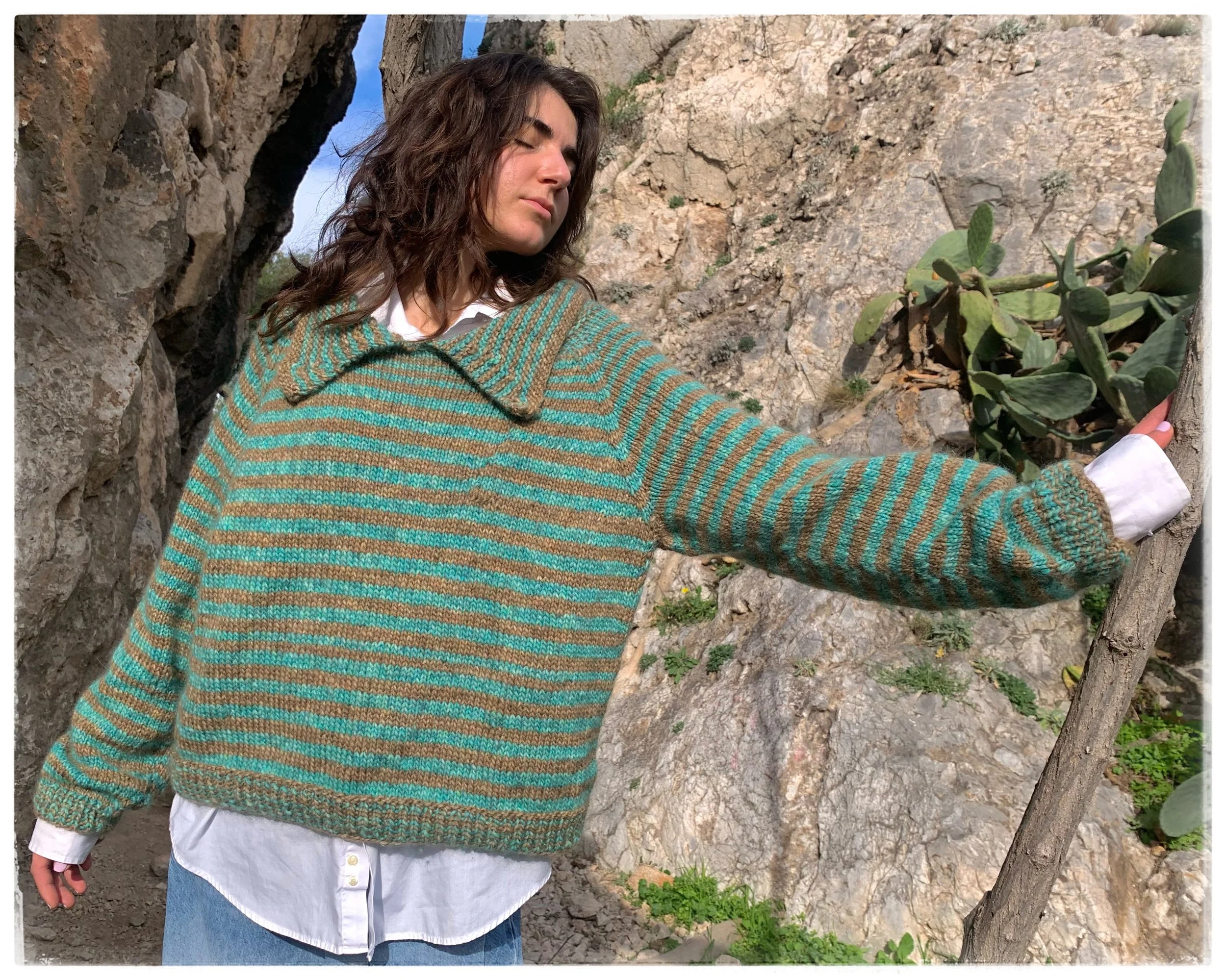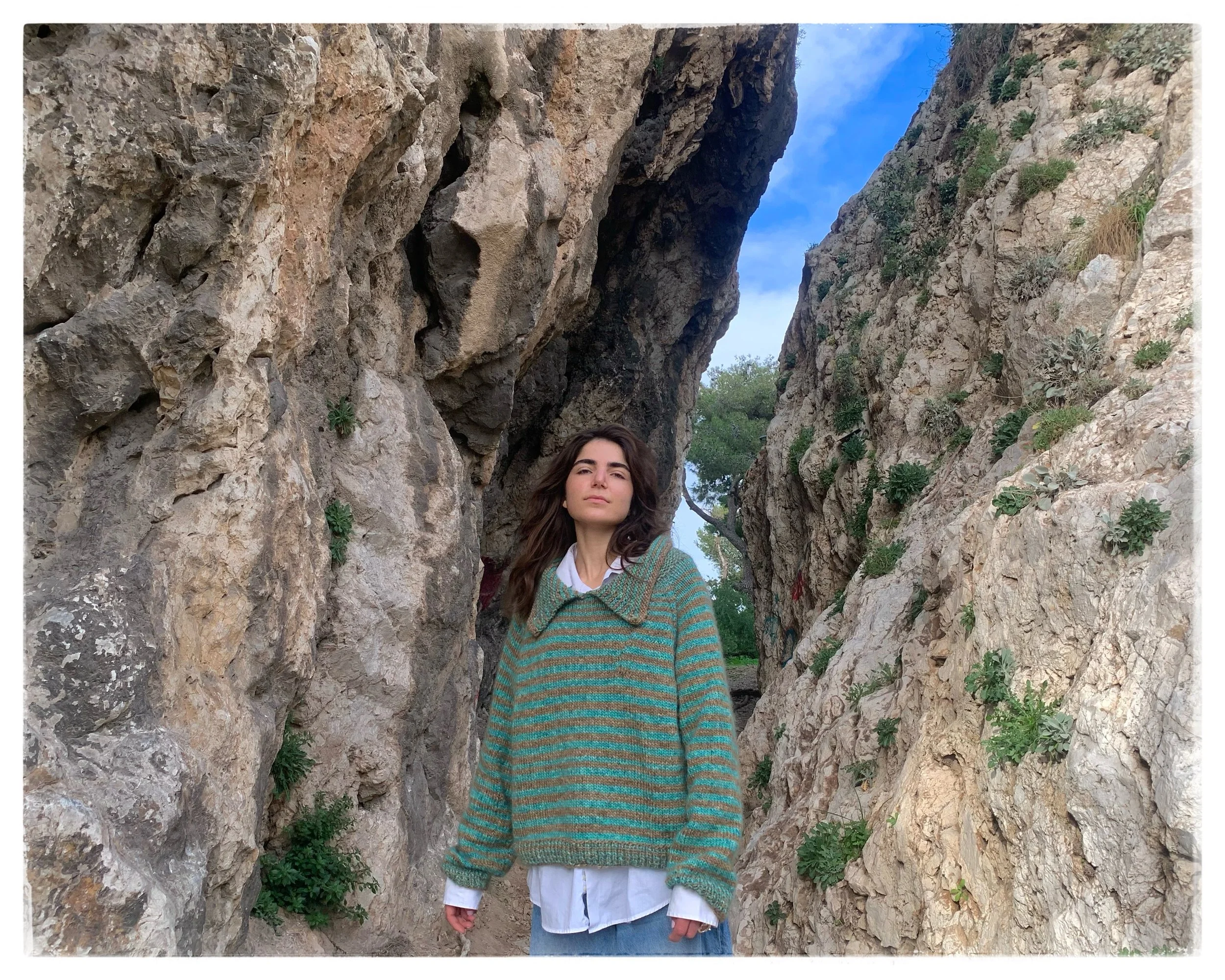 I began knitting it in the backseat of a car during our four-hour drive from Athens to Meteora, a monastic mountain village crowned with twelve ancient monasteries. The sweater grew on the four-hour ferry ride from Athens to Mylos—a small island with caves, lunar landscapes, and an energy that feels like Atlantis. We traveled there in winter. The island was freezing and nearly desolate as I knit through wind and rainstorms, feeling the clear, glorious air, sea, and sky.